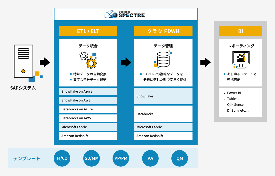 BusinessSPECTRE XC(ビジネススペクトル クロスクラウド)は、SAPデータをクラウドDWHへ転送するソリューションです