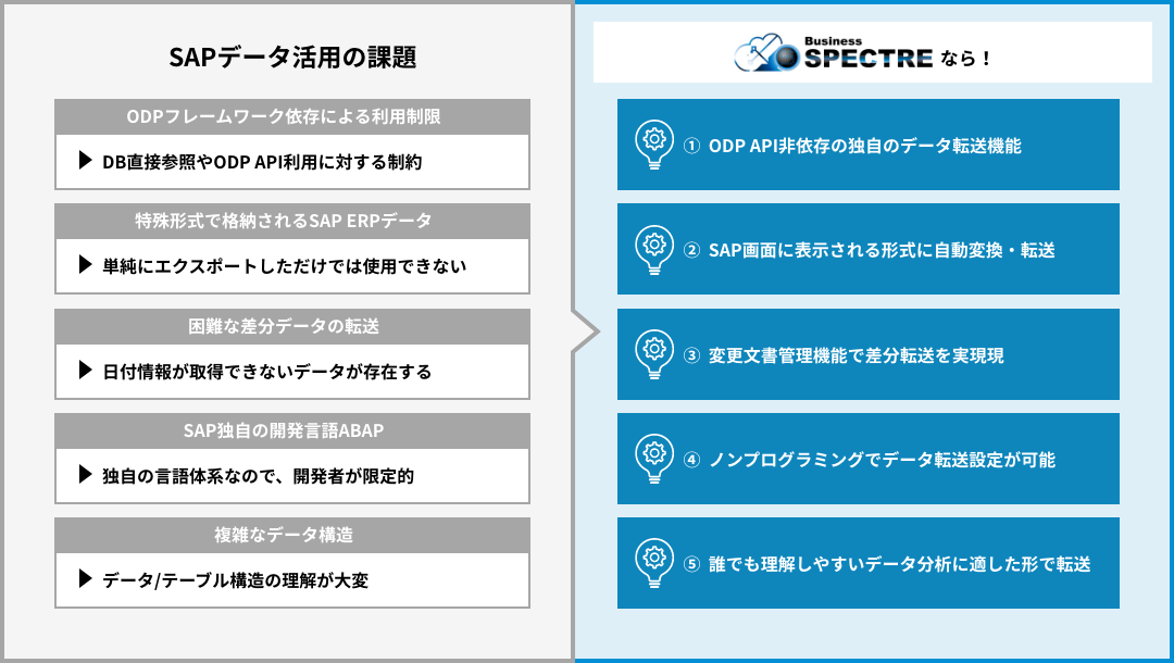 BusinessSPECTRE XCは、独自の機能により、SAPデータ活用にまつわる様々な課題を解決します。